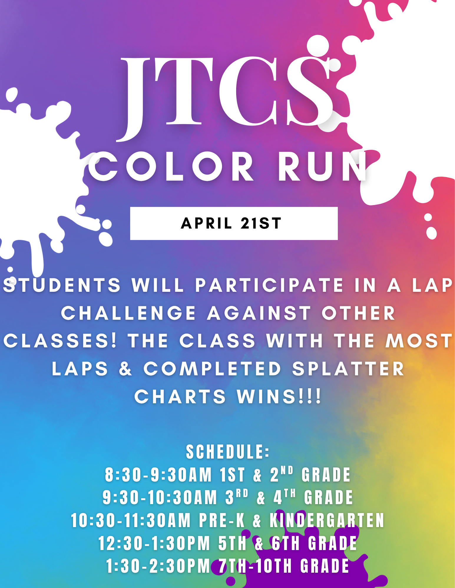 JTCS operates on a traditional school calendar of 180 days! School starts at 8:00 AM and ends at 3:00 PM. Early drop off starts at 7:00 AM.
